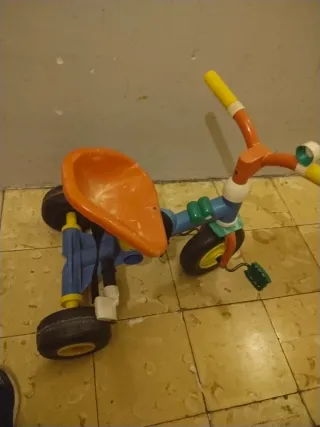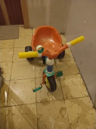 Triciclo infantil de color naranja, ideal para los más pequeños. Cuenta con un diseño divertido y seguro. - Ruedas resistentes. - Manillar amarillo. - Pedales verdes.