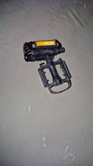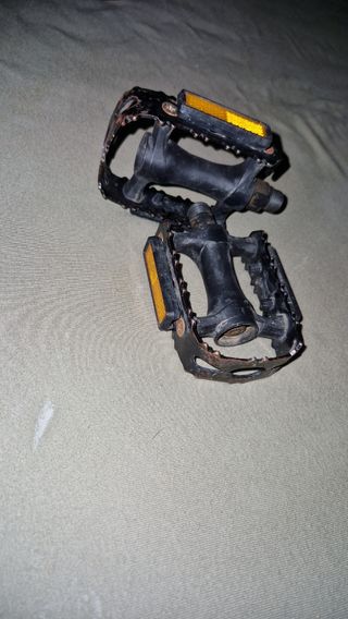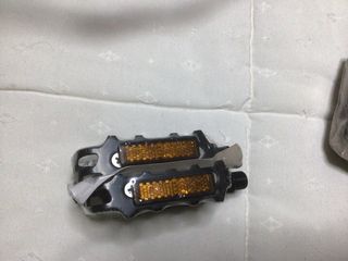 Pedales totalmente metálicos con catadioptricos. Tienen bastante uso pero se conservan muy bien. Resistentes a golpes y caídas.