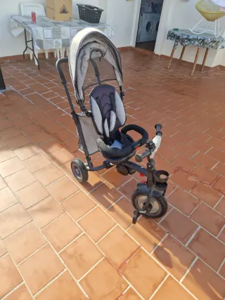 Triciclo infantil con un diseño moderno y funcional, ideal para paseos. - Estructura principal en color gris. - Asiento acolchado en gris y negro. - Capota protectora. - Ruedas resistentes. - Pedales extraibles - Posapies plegable - Respaldo ajustable - Asiento desplazable varios cm - Parasol - Timbre - Posavasos La direccion se puede activar y desactivar con una pestaña para poner manejarlo un adulto desde atras o dejar al peque que aprenda a manejar solito. Ha tenido muy poco uso, se vende por falta de espacio. Esta en óptimas condiciones.