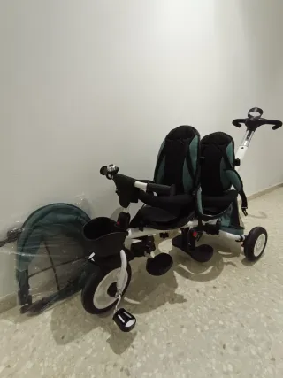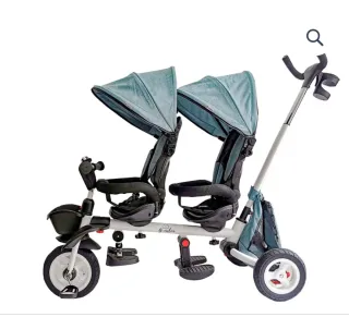 Triciclo gemelar de la marca G-Melar, diseñado para dos bebés. - Dos capotas para protección solar. - Asientos con arnés de seguridad. - Reposapiés para mayor comodidad. - Manillar de empuje ajustable. - Cesta de almacenamiento. - Ruedas delanteras y traseras. - Porta Botellas - Pedales - Máx. Peso soportable 50kg - Edad Recomendada: 10-36 meses