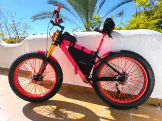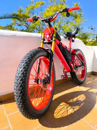 ✨(NUEVA - IMPECABLE)✨ Bicicleta Fatbike de diseño EXCLUSIVO y ESPECTACULAR apariencia de moto. ✅ Ruedas anchas para todo tipo de terrenos. (NIEVE, PLAYA, MONTAÑA) ✅ Cuadro, llantas, todo aluminio, no pesa, igual bicicleta normal. ✅ Horquilla aire delantera. descenso regulable dureza. ✅ Sillín ultra-cómodo tipo sofá anti-prostático. ✅ Frenos disco. ✅ Potencia ultra-ligera. ✅ Bolsa transporte en cuadro. ✅ Manillar ultra-ancho doble altura. ✅ Muchos extras: - Luces delanteras, Leds RGB - Sistema alarma, mando a distancia y bocina. - Monoplato y cambio 9 vel. Shimano. - Frenos hidráulicos Shimano. - Pedales anchos. ✅ NO ES ELÉCTRICA