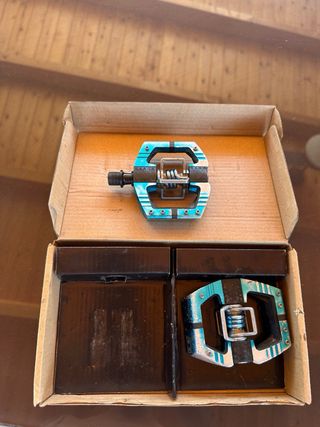 Pedales Crankbrothers Mallet E, prácticamente nuevos. - Dos pedales Crankbrothers Mallet E incluidos. - Diseño en color azul turquesa y plateado.