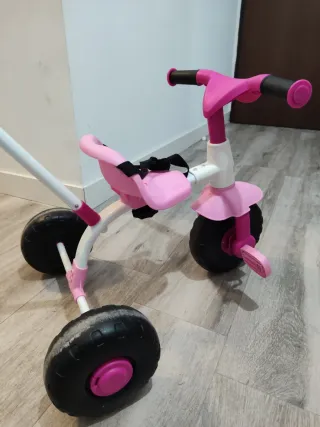 Triciclo y bicleta (tipo moto dos dos ruedas) de aprendizaje Teeny de Olmitos, ideal para los primeros paseos. - Diseño ligero y ergonómico. - Ruedas resistentes para mayor durabilidad. - Asiento cómodo y ajustable. - Manillar con puños antideslizantes. Muy poco utilizado como se puede apreciar en las fotografías de las ruedas y del sillín. Se pueden enviar más fotografías.