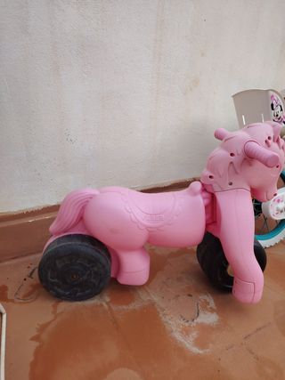 Primera bicicleta con diseño de Minnie Mouse para niña. Ideal para aprender a pedalear. Se compró en 2021 o 2022 en Toys'R'Us y el precio hoy para una nueva es approx €155 Pero mi hija no la usó mucho. Está casi como nuevo en el sentido que funciona muy bien, pero se han gastado un poco los colores etc. por estar mucho fuera. Ruedas son muy buenas, sin cambios. - Color rosa y blanco. - Ruedines de apoyo que se puede montar o desmontar. - Asiento ajustable - Tiene un asiento atras para sentar a un muñeco