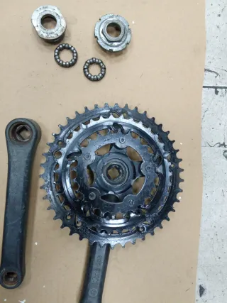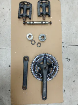 Conjunto de piezas para bicicleta, incluyendo pedales, eje y platos. - Dos pedales negros. - Eje central. - Plato con bielas. - Rodamientos y arandelas. Lo de la foto por solo 5€
