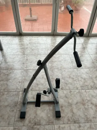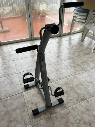 Pedaleador compacto de color gris, diseñado para ejercitar piernas y brazos. Sé puede graduar altura - Estructura metálica. - Pedales con correas. - Empuñaduras acolchadas.