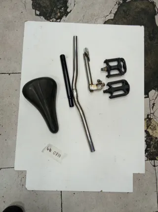 Lote de componentes para bicicleta. - Sillín negro. - Dos pedales negros. - Manillar plateado. - Potencia de manillar plateada. Tal como se ve en las fotos,todo por 5€