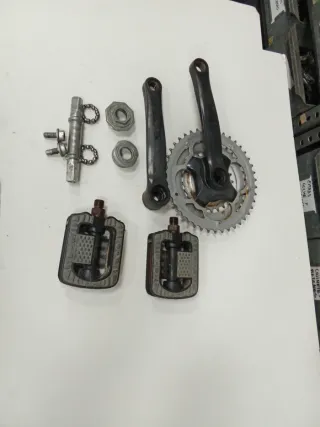 Lote de componentes para bicicleta, ideal para reparaciones o mejoras. - Dos pedales de plástico y metal. - Juego de bielas con plato. - Eje de pedalier con rodamientos y tuercas.todo por 5€