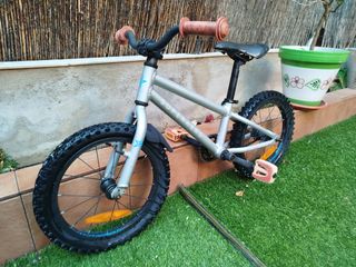 Bicicleta infantil de color naranja en perfecto estado, ideal para los más pequeños. - Ruedas de 16 pulgadas. - Frenos delanteros y traseros. - Sillín ajustable en altura. - Pedales antideslizantes.