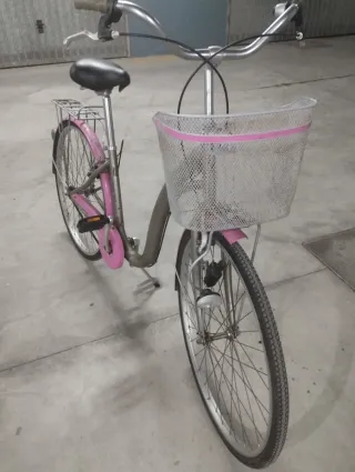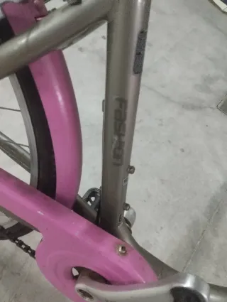 Bicicleta de paseo con un diseño moderno y llamativo. - Cuadro de metal en color gris. - Guardabarros y detalles en color rosa vibrante. - Cadena y pedales visibles.