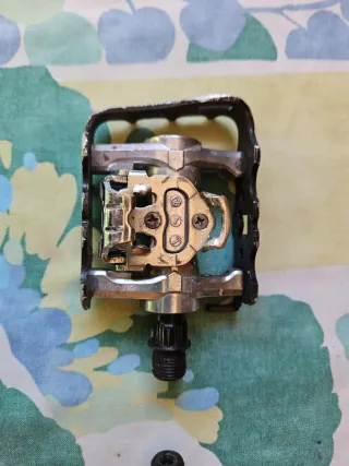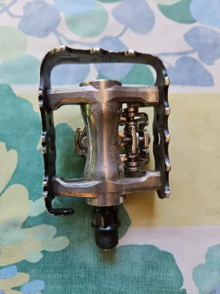 Pedal de bicicleta para el lado izquierdo, de tipo mixto. Funcciona perfectamente bien pero el derecho ha perdido parte del borde aunque funcciona muy bien con calas. Se regala este por la compra del pedal bueno😀 - Mecanismo de anclaje. - Cuerpo metálico.