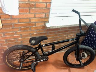Bicicleta BMX de color negro, lista para rodar. - Cuadro de BMX. - Ruedas de BMX. - Manillar de BMX. Rueda tracera(frecooster Haro) (Aro trebol) (Cubierta. Rant Rueda delantera. (Maza stranger) (Aro. 34r) Cubierta animal(desgasta) Pegs 4 Sillin (34r) Tubo pivotal.( Culd) Pontencia. (Sunday) Manillar. (Fiend) Pedales. (Rant) Plato (saltplus) Lo q es bielas y cuadro no lo se pero estan en buen estado cuadro talla 20,75