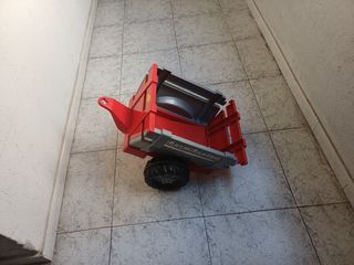 Tractor de juguete de color rojo con remolque. - Diseño robusto. - Ruedas negras. - Inscripción FarmTrailer en el lateral. A penas sin uso pues lo teníamos en una segunda residencia. El remolque está sin estrenar. Por su tamaño, no hago envio.