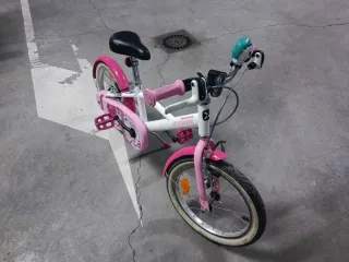 Bicicleta infantil BTWIN en color rosa, ideal para niñas de 4 a 6 años. - Ruedas de 16 pulgadas. - Diseño divertido con detalles. - Puños y pedales a juego. Ruedines.
