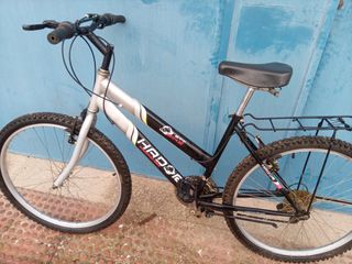 Bicicleta de montaña en buen estado, lista para usar. - Ruedas de 24 pulgadas. - Cuadro de color negro con detalles en azul. - Manillar y horquilla delantera en azul. - Sillín negro. - Incluye pata de cabra.