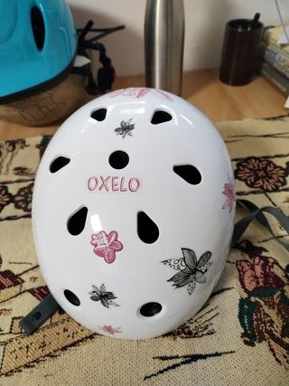 Casco para bicicleta infantil de la marca OXELO, talla 55-58. Está en buen estado y tiene un diseño con flores. Practicamente nuevo - Marca: OXELO - Talla: 55-58 - Diseño floral - Color blanco