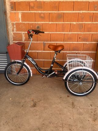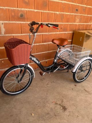 Triciclo de tres ruedas con un diseño clásico y funcional. Perfecto para paseos al aire libre. - Cesta delantera de mimbre. - Asiento cómodo. - Ruedas resistentes.