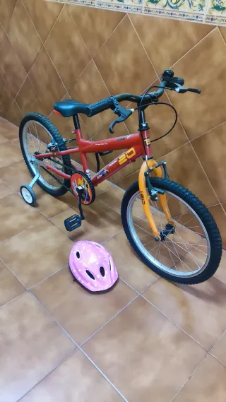 Bicicleta infantil de 20 pulgadas, ideal para niños y niñas que están aprendiendo a montar. Incluye ruedines para mayor estabilidad y un casco de regalo para su seguridad. Nunca se ha usado, costó el doble del precio que pongo. - Color rojo y naranja. - Ruedines incluidos. - Casco rosa con puntos blancos.