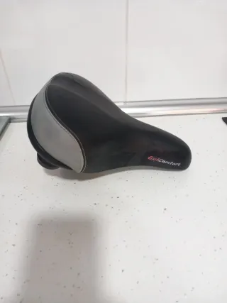 Sillín de bicicleta con gel para mayor comodidad. Diseño en dos tonos, negro y gris, con costuras blancas. - Cubierta de gel. - Diseño ergonómico. - Marca: GelComfort.