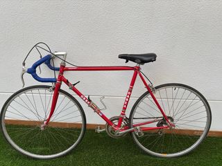 Bicicleta de carretera clásica Orbea Orduña del año 1978. Un modelo icónico para coleccionistas y amantes del ciclismo vintage. Muy bien cuidada, le funcionan las marchas y los frenos, solo tiene cositas estéticas como el sillín y un poco de óxido - Cuadro de acero Orduña. - Color rojo. - Manillar de carretera con cinta azul. - Sillín negro. - Portabidón.