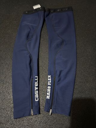 Perneras de ciclismo Castelli en talla M. Perfectas para proteger tus piernas del frío. - Color azul. - Logo de Castelli en rojo.