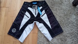 Pantalones cortos de la marca Troy Lee Designs, ideales para MTB. - Diseño en color negro con detalles gráficos en verde neón y naranja. - Logotipo de la marca en la pernera izquierda. - Estampado gráfico distintivo en la pernera derecha. - Cierre con botón y cordones en la cintura. - Talla 38. Talla justa.