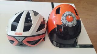 Dos cascos, uno para mujer y otro para niñ@s, ideales para la bicicleta. Uno blanco y rosa, otro naranja y negro. Se encuentran en buen estado. - Talla adaptable. - Correas ajustables. - Diseño cómodo y ligero. Precio 15€ los dos, 10€ por separado.