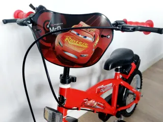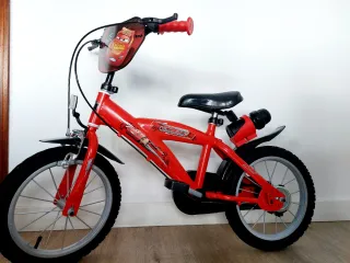 Bicicleta infantil con diseño de Disney Cars. - Color rojo vibrante. - Manillar con diseño de Rayo McQueen. - Ruedas de entrenamiento incluidas. - Botella de agua incluida