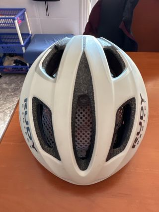 Casco de bicicleta de la marca Rudy Project. Diseño aerodinámico y ventilado. - Color blanco con detalles en gris. - Múltiples rejillas de ventilación. - Logo de la marca en los laterales.