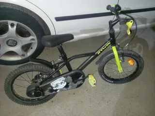 Bicicleta infantil de la marca Btwin, ideal para los más pequeños. Alguna marca del uso pero en perfectas condiciones - Ruedas de 16 pulgadas. - Diseño en color negro y detalles en verde lima. - Sillín negro. - Pedales amarillos.