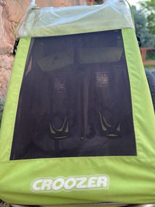 Remolque Croozer versátil para dos niños, ideal para usar en bicicleta, correr o como cochecito de paseo. Su diseño permite múltiples usos. - Color verde lima y gris. - Arnés de seguridad de 5 puntos. - Ruedas y accesorios para bicicleta, correr o paseo. - Accesorio extra toldo con protección solar marca Croozer - Capota con protección solar y mosquitera. - Opcional hamaca para bebe a partir de 6 meses.