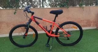 Bicicleta de montaña de 24"en color naranja y negro. ‼️Muy poco uso‼️ - Marca: Btwin Rockrider 500 - Ruedas de 24 pulgadas. - Frenos de disco. - Cambio Shimano. - Accesorios nuevos: funda de sillín (Memoryfoam), patacabra, porta bidón de agua, y luces delantera y trasera.