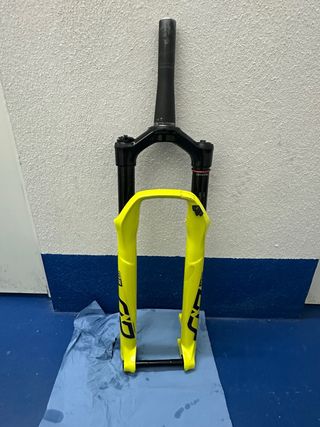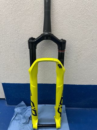 Horquilla de suspensión RockShox SID Ultimate en color amarillo brillante. - Diseño de alta gama para ciclismo. - Acabado en amarillo vibrante con detalles negros. Las barras están perfectas ni una marca.Se incluye eje pasante. Tubo cortado a 165