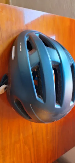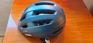 Casco de bicicleta Btwin en color azul. Diseñado para ofrecer protección y comodidad. - Diseño ventilado con múltiples aberturas. - Correa ajustable para un ajuste seguro. - Marca Btwin visible. - Talla M, con rueda ajustable