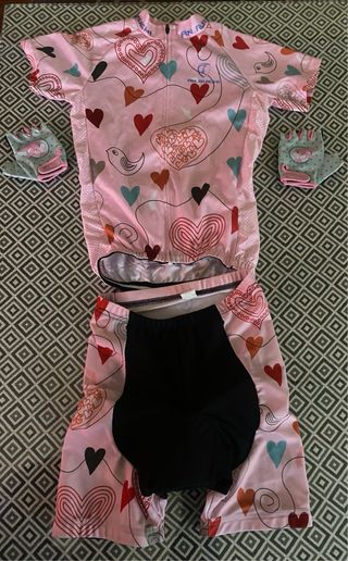 Conjunto de maillot y culotte infantil con un divertido estampado de corazones. - Maillot de manga corta. - Culotte con badana. - Guantes. - Diseño colorido y alegre.