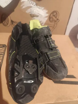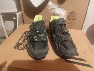 Zapatillas de ciclismo negras con detalles en verde lima. Cuentan con un sistema de cierre de velcro para un ajuste seguro. - Cierre de tres velcros. - Suela con tacos. - Interior textil.