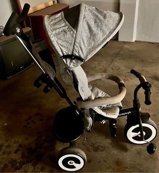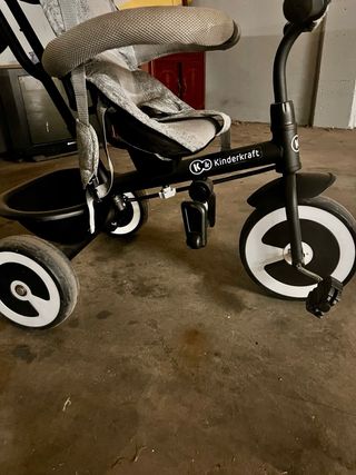 Triciclo evolutivo de la marca Kinderkraft, ideal para acompañar el crecimiento del niño. - Diseño moderno en color gris y negro. - Barra de seguridad. - Reposapiés. - Capota. - posavaso - Ruedas de goma