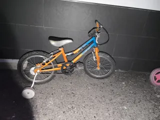 Bicicleta infantil con un diseño llamativo en colores naranja y azul. Perfecta para los más pequeños. - Ruedines de apoyo incluidos. - Sillín ajustable. - Manillar con puños de goma.
