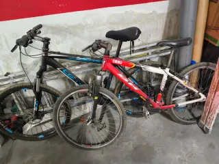 Se venden dos bicicletas de montaña. Una está lista para usar y la otra necesita algunas reparaciones. - Bicicleta negra con detalles azules. - Bicicleta roja y blanca.