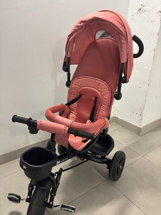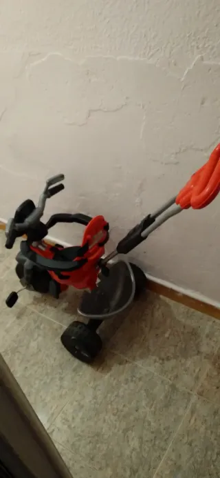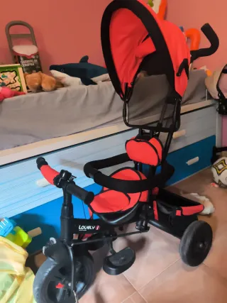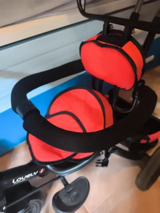 Triciclo infantil de color rojo y negro, con la marca Lovely visible. - usado pero en muy buen estado - Asiento acolchado. - Capota protectora. - Reposapiés. - Ruedas traseras amplias.