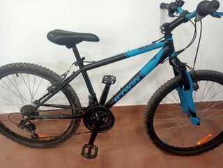 Bicicleta B'TWIN Rockrider de 24 pulgadas, ideal para jóvenes ciclistas. - Cuadro resistente en color negro y azul. - Ruedas de 24 pulgadas con buen agarre. - Sillín cómodo y ajustable. - Frenos fiables para mayor seguridad.
