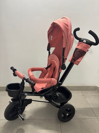 Triciclo Kinderkraft Velo en color rosa, ideal para paseos. - Incluye empujador para padres. - Diseño moderno y funcional. - Asiento cómodo y seguro.
