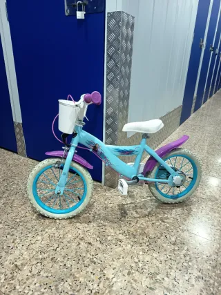 Bicicleta infantil de 14 pulgadas con temática de Frozen. Ideal para los más pequeños. - Color principal azul con detalles morados. - Incluye cesta delantera blanca. - Ruedines no visibles en la imagen.