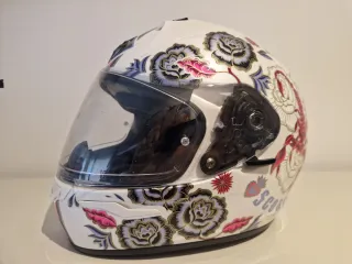 Casco de moto blanco con un diseño floral en tonos rosas, azules y dorados. Presenta un acabado brillante y detalles intrincados. - Diseño floral detallado. - Visera transparente. - Cierre de seguridad.