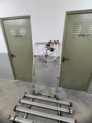 Soporte de metal rojo para colgar 2 bicicletas en la pared. Cuenta con mangos de goma negra para proteger el cuadro de la bicicleta. Tengo 2 soportes fijos como el de la fotografía y uno plegable. Vendo cada soporte por 10€ cada uno