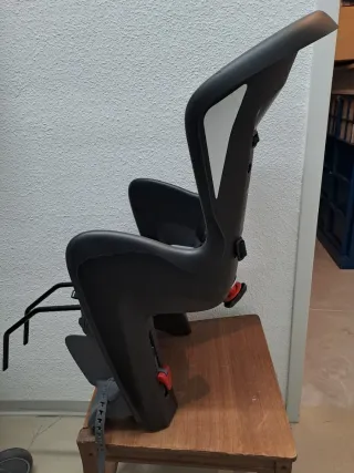 Silla para bicicleta de color negro y gris, diseñada para transportar niños de forma segura hasta 22 kilos. Usado solo en 3 ocasiones - Asiento acolchado. - Arnés de seguridad de 3 puntos. - Reposapiés ajustables.