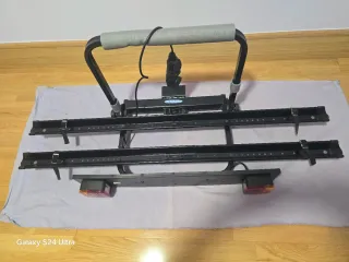 Portabicicletas de color negro para coche, con un diseño robusto y práctico. - Equipada eléctricamente, para su uso - Incluye dos luces traseras. - Barras de sujeción ajustables. - Asa acolchada para mayor comodidad.
