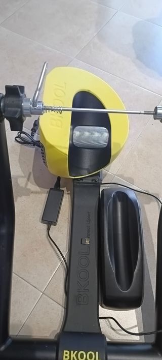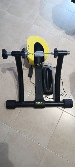 Rodillo Bkool Smart Pro 2 en buen estado. Características – Rodillo Bkool Smart PRO 2 Potencia: hasta 1.200 vatios. Simulación de pendiente hasta el 20 %. Simulación de inercia en zonas de bajadas Compatible con ruedas desde 20″ a 29″. Comunicación mejorada vía ANT+ y Bluetooth con el simulador. Emisión sonora: 68dB a 35KM/h Peso (fabricante): 11.6 kg. - Incluye el rodillo, cable de alimentación y adaptador ANT+ (por USB). - Perfecto para entrenar en casa. - Diseño negro y amarillo. Regalo 1 rueda con cubierta específica para rodillo marca ELITE (con bastante uso) y otra cubierta también específica, marca Van Rysel.