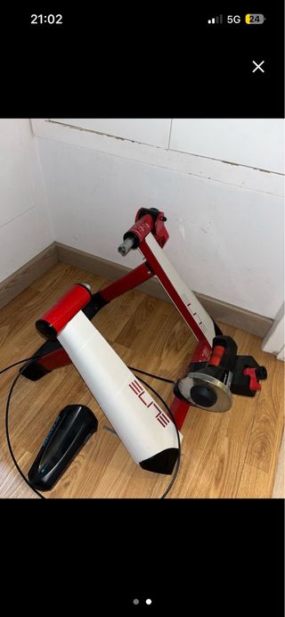 Rodillo de entrenamiento Elite Turno con tecnología Smart Fluid. - Muy poco uso, 5-6 veces. - Compatible con bicicletas de carretera y montaña. - Incluye cassette shimano 105 de 11 velocidades.