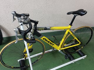 Bicicleta de carretera Giant en excelentes condiciones. Ideal para rutas y entrenamientos. Se vende con rodillo de equilibrio y zapatillas de ciclismo número 43. - Modelo Giant, color amarillo y negro. - Llantas en buen estado. - Lista para usar.